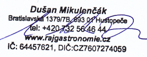 10.6. Kontaktní údaje prodávajícího: adresa pro doručování Bratislavská 1379/7B, 693 01 Hustopeče, Česká republika, adresa elektronické pošty info@rajgastronomie.cz, telefon +420 732 56 46 44.